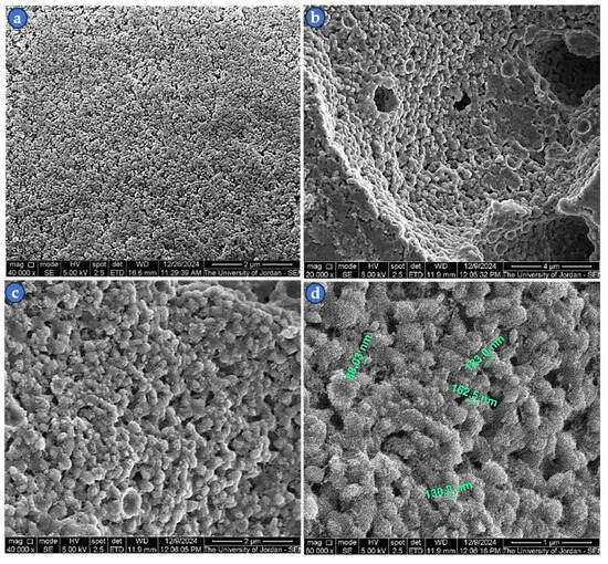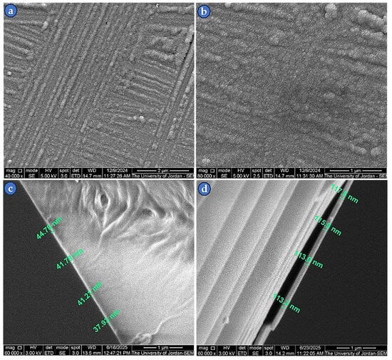 The SEM was used to examine the microstructure of the ZnS thin films produced via E-beam evaporation, as can be seen in Figure 7a–d. Image (a) shows a mat-like structure with a rough surface at a magnification of 40,000×, while image (b) displays the microstructure at a higher magnification of 80,000×, from which it can be seen that the particle size is in the nanoscale with an almost spherical shape. The high roughness may be due to the evaporation discontinuity, as the densities of the sintered ZnS pellets were lower than the theoretical values. The images (c and d) reveal labeled cross-sectional views of 40 nm and 111 nm thin films, and the measured thicknesses were approximately 41 nm and 115 nm, respectively. These values are very close to those obtained using the FilmTek 3000 spectrometer, Scientific Computing International, Carlsbad, CA, USA, which were 40 nm and 111 nm, respectively.