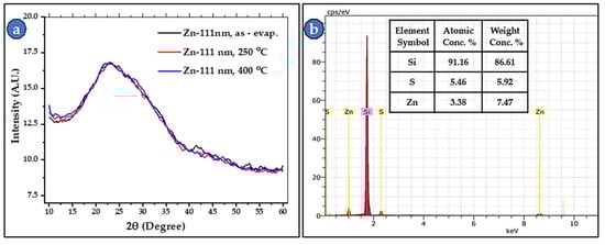 Figure 8a displays the XRD patterns of 111 nm ZnS thin films of the three cases (as-evaporated, annealed at 250 °C for 6 h, and annealed at 400 °C for 6 h). The examined thin films showed an amorphous structure, which could be attributed to the low substrate deposition temperature. There are no peaks indicative of crystallization. The formation of amorphous ZnS thin films is due to two main factors: the low deposition temperature and the E-beam evaporation method. The films were deposited at RT, which is obviously insufficient for forming crystalline ZnS thin films. The E-beam evaporation process vaporizes and may slightly fragment the source material, which usually leads to amorphous thin-film condensation on the substrate unless a higher deposition temperature is used or high-temperature post-annealing is applied after thin-film deposition [34]. The heating of the substrate during deposition is probably a crucial factor for the crystallization of these thin films. The EDS analysis confirmed the formation of the ZnS compound during the deposition process, as shown in Figure 8b. The spectrum reveals the existence of Zn and S peaks and the peak of Si substrate. The used E-beam method confirms the chemical analysis for the deposited thin film of ZnS.