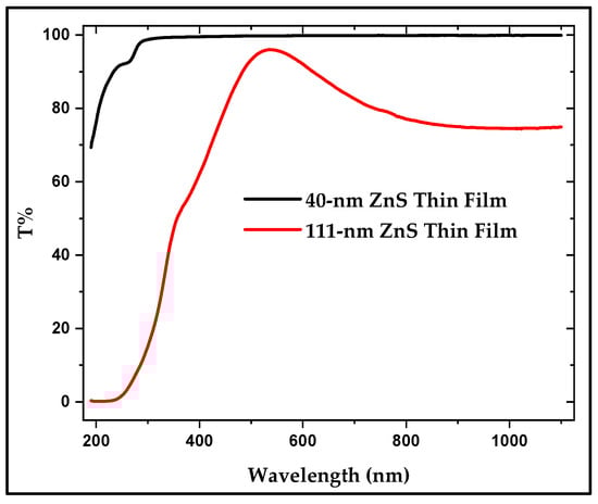 The Percent Transmittance (T%) of the UV–Visible spectra for the two evaporated samples is shown in Figure 9. This figure shows clearly that both samples, the 40 nm and the 111 nm samples, are transparent in the near-IR, Visible, and most of the UV regions. This renders ZnS thin films good window materials and protective coatings in the described region. The thickness dependence of T% is also obvious in this figure.