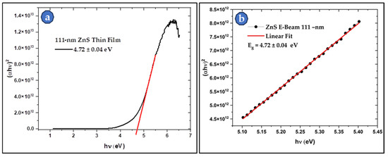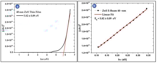 Figure 10 and Figure 11 present the Tauc’s plots and the linear region fit for the 40 nm and the 111 nm samples, respectively. The Eg calculations show a direct dependence on the thickness of the deposited film. It was found that the Eg increases as the thickness decreases. The reported bulk Eg for ZnS is around 3.6 eV, while the values for the studied thin films were around 4.82 eV and 5.82 eV for the 111 nm and 40 nm thin films, respectively. The Eg values of the thin films are 31%–62% higher than those of thick films and the bulk ZnS material. This thickness dependence of the Eg of ZnS thin films has been reported by many researchers [33,34,35,36,39]. Generally, the Eg of ZnS thin films increases as the film thickness decreases. This behavior is attributed to quantum confinement effects, stresses and strains in the films, defects in the structure of the films, and grain boundaries in the case of polycrystalline thin films. Due to the small thickness, quantum confinement becomes more pronounced, and the electrons and holes become confined, which increases their energy levels and hence increases the Eg. Stresses and strains in the films also alter the band structure and directly affect the Eg [41,42,43]. This attractive feature makes ZnS films a good choice for applications where Eg engineering is needed. Hence, the Eg of ZnS thin films can be simply controlled by varying film thickness.