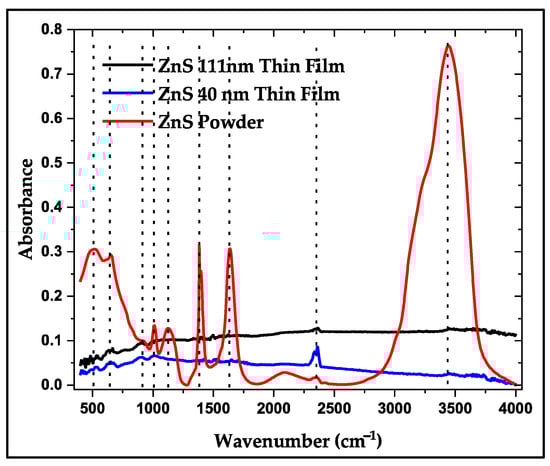 FTIR spectra of synthesized ZnS powder and the two thicknesses of the E-beam-evaporated thin films. Dotted lines represent the main peaks of the spectra.