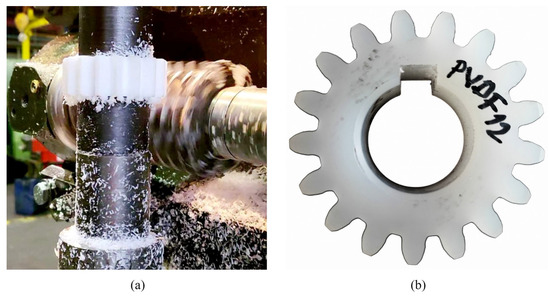 The PVDF gear samples were manufactured by conventional machining, specifically hobbing (Figure 1a), due to the small sample quantity and required tolerance. These samples (Figure 1b) were made from PVDF rods with a 60 mm diameter, slightly larger than the gear tip diameter.
