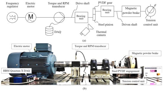 Experimental testing was conducted using a specially developed open-loop test rig (Figure 2a,b). PVDF gear samples were mated with steel pinions and subjected to dry friction conditions in a laboratory environment at 20 °C and constant humidity. The testing parameters, designed to mirror expected real-world operational conditions, included three load levels (4 Nm, 5 Nm, and 6 Nm) and a rotational speed of 1000 rpm. The reference load levels were also selected based on the gear geometry in real-life applications, with the specified values associated with the working regimes of gear pumps and conveyor systems. Even though gear geometry can be used at lower load levels, such a design would not meet the lightweight design requirements, as the rotary motion transmission could be accomplished with smaller gears. Each test under these conditions was repeated three times to obtain statistically reliable data for precise engineering and design. The open-loop configuration was powered by a three-phase electric motor (Marathon Electric HJA-IE2 132 M, Regal Rexnord Corporation, Wausau, WI, USA), which serves as a power supply to an open-loop configuration.