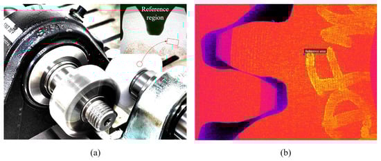 The rotational speed of the electric motor, controlled by a frequency regulator (En600-4 T 0075G/110P, Shenzhen Encom Electric Technologies CO, Shenzhen, China), is transferred to the drive shaft (i.e., the steel gear) via elastic couplings and bearing units. The torque transducer (HBM T20WN T153040, Hottinger Baldwin Messtechnik GmbH, Darmstadt, Germany) is linked to the Quantum X DAQ used to monitor and acquire torque and rotational speed data. The polymer gear, in engagement with the steel pinion, is mounted on the driven shaft coupled to the magnetic powder brake (FZ-12-K TB-200S, Yun Duan, Taiwan, China), which is used to simulate load level, that is, precisely regulate torque, through a tension control unit. The bulk temperature increase in PVDF gear samples was monitored at the reference tooth root region with a thermal camera (FLIR A 700, FLIR Systems AB, Titisee, Täby, Sweden). The temperature of the reference region in the area of the tooth root of PVDF gears, presented in Figure 3a, was monitored with the 1-pixel marker designated in a thermal analysis software (FLIR Research Studio, ver. 2024.07.2, Teledyne Technologies Inc., Thousand Oaks, CA, USA), as shown in the thermal view in Figure 3b.
