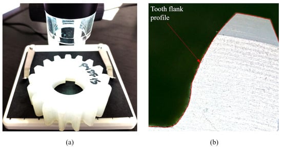 Digital processing of the tooth profile for PVDF gears was performed using a digital microscope (NB-MIKR-500, Transfer Multisort Elektronik, Łódź, Poland), i.e., employing the edge-recognition ability. In this way, worn-out tooth profiles can be digitized with a high accuracy of 10 µm and compared with the initial unworn involute geometry to establish wear-related data [56]. Optical processing of the geometry of the tooth flank was performed at 22 times magnification. The digital processing, using an optical microscope, is presented in Figure 4a, while Figure 4b presents the digitalized tooth profile.