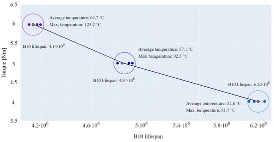 The lifetime results of the PVDF gear samples at reference load levels are presented in Figure 5. Lifetime data at each load level were generalized using the Weibull analysis, which can provide statistically relevant data for a smaller number of tests [57]. Using the Weibull distribution, data from three test repetitions at each load level formed the lifespan curve based on the 90% survival rate limit, commonly referred to as the B10 lifetime (the point at which 10% of components made of a specific material are expected to fail). As shown in Figure 5, higher load levels result in shorter lifetimes of PVDF gears, with a maximum B10 lifetime of 6.32 × 106 cycles at the load level of 4 Nm. In addition, data on mean and maximum temperature values are provided to establish the correlation between the load level and the developed temperature.