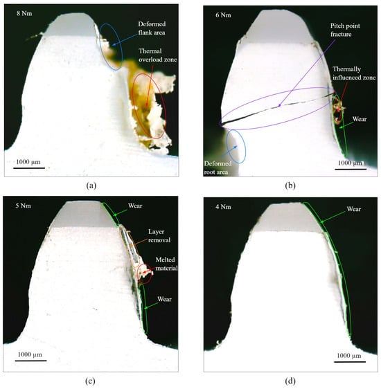 Polymer gear samples, presented in Figure 7, indicate several types of failure mechanisms at specific testing conditions. As each test at a specific load level was repeated three times, the occurrence of these failures can reveal the nature of the complex temperature-dependent material properties of polymer gears. Each sample, regardless of load level, experienced a thermal overload. However, the melting failure was only decisive for the 8 Nm level; therefore, 25% of the tested samples experienced pure thermal overload. The other 75% of samples experienced gradual thermal effects on the tooth flank areas, where the thermal effects on samples tested at 4 Nm can be accounted for only in late phases of engagement due to a sudden increase in temperature. The wear mechanism, with different wear rates at each load level, occurred at 75% of the tested samples, while the pitch point fracture occurred at 50% of the tested samples on corresponding torque levels of 5 Nm and 6 Nm—25% of samples tested at the 4 Nm load level experienced tooth root fracture. The specific deformation of the tooth root area, notable in Figure 7b, only occurs at the 6 Nm load level, i.e., 25% of the tested samples, meaning that the distortion of the root area corresponds to load level and developed bulk temperature. When it comes to analyzing failure modes, it is also very important to distinguish the complex nature of fatigue-related phenomena. The presented wear-induced changes, which lead to material loss over time, can be classified as fatigue wear. Even though wear and fatigue are distinct failure mechanisms, they are interconnected due to repeated loading cycle actuation over the tooth flank. However, as wear and fatigue behavior are strongly influenced by temperature increase, the thermal softening and the alterations in the viscoelastic effects of the tooth flank result in a reduction in the stiffness of polymer material and surface defects, such as thermal cracks, which act as stress concentrators, making the tooth flank more susceptible to wear, i.e., the temperature rise induces the so-called thermal wear.