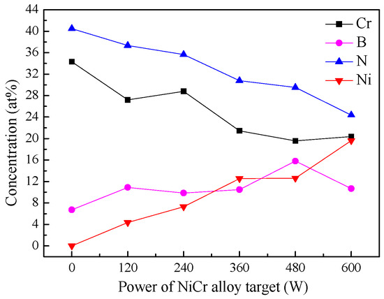 The variation in Cr, B, N, and Ni element concentration as a function of NiCr alloy target power is illustrated in Figure 1. It has been found that with the increase in sputtering power of NiCr alloy target from 120 W to 600 W, the Ni concentration in CrNiBN coatings increases from 4.35 at.% to 19.62 at.%. According to the XRD results reported in our previous work [29], three diffraction peaks of CrN (111), CrN (200), and CrN (220) at 36.7°, 43.1°, and 62.5° were observed (JCPDS 11-0065), which demonstrates the face-centered cubic structure. With increasing Ni content, the intensity of CrN (111) in CrNiBN coatings varies slightly. With regard to the XPS results, a major Ni-Ni bond around 853.0 eV and a strong B-N bond around 190.3 eV were detected [29]. This demonstrates that Ni is mainly bonded with Ni while B is mainly bonded with N. By considering XRD and XPS results together, CrNiBN coatings present a nano-composite structure composed of CrN crystals and amorphous matrix.