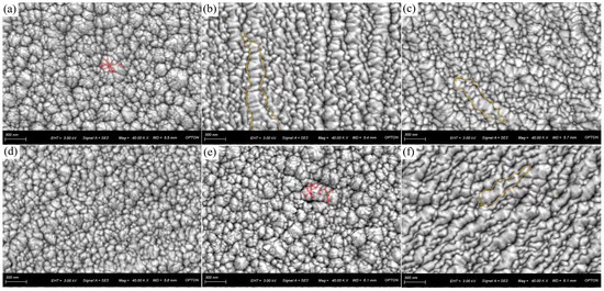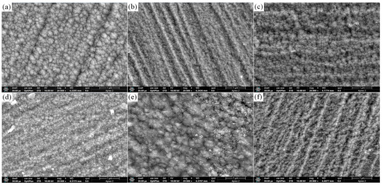 In order to investigate the influence of Ni concentration on the surface porosity, the surface morphologies of coatings were observed at the magnification of 40,000× under secondary electron mode, which are illustrated in Figure 2. It could be seen that the CrBN coating presents the cauliflower-like morphology, and many small gaps are observed on each crystal column marked by red line in Figure 2a. In contrast, after Ni incorporation, the CrNiBN coatings present smooth morphology without any small gaps on crystal columns. Moreover, some crystal columns connect to each other so as to form big and long crystal columns, which have been marked by a yellow line in Figure 2b,c,e.