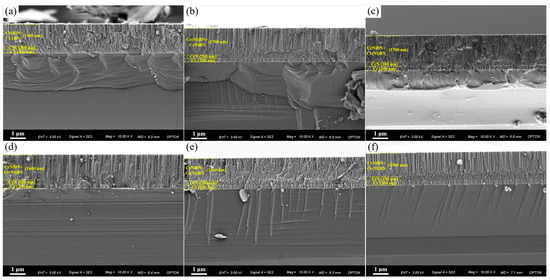 The cross-sectional morphologies of (a) CrBN, (b) CrNiBN-120, (c) CrNiBN-240, (d) CrNiBN-360, (e) CrNiBN-480, and (f) CrNiBN-600 coatings.