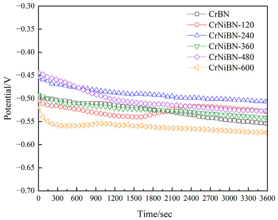 The open circuit potential can reflect the occurrence difficulty of corrosion, and therefore the OCP curves of CrBN and CrNiBN coatings are illustrated in Figure 5 for comparison. As is shown, except CrNiBN-600 coating, the OCP of other coatings decreases gradually during the first 900 s owing to the infiltration process of 3.5 wt% NaCl solution. After 900 s, the OCP curves enter relatively steady state. For comparison, the OCP values at the ending point are compared. It is obvious that except for the CrNiBN-600 coating, the other CrNiBN coatings present higher OCP values from −0.507 V to −0.542 V compared to −0.554 V from the CrBN coating due to the incorporation of Ni. This indicates that the moderate incorporation of Ni (4.35 at%−12.62 at%) could lower the corrosion occurrence. Two reasons contribute to this result. The first one is the relative potential. Typically, the potential of saturated calomel electrode relative to standard hydrogen electrode is 0.244 V, and the potential of Ni relative to standard hydrogen electrode is −0.250 V. Therefore, the potential of Ni relative to saturated calomel electrode is −0.494 V. As stated above, the OCP value of CrBN coatings is −0.554 V, which is lower than −0.494 V. Thus, doping Ni into CrBN coatings would shift the OCP more positively, and similar phenomena has been found in Ni-CrSiN coatings system [28]. The second one is the lower surface porosity after Ni incorporation which has been presented in Section 3.2. The low surface porosity would hinder the penetration of 3.5 wt% NaCl solution, thus leading to high OCP values.