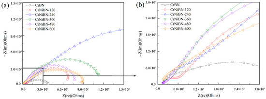 Electrochemical impedance spectroscopy (EIS) is a frequency domain measurement method that uses small-amplitude sinusoidal potential or current as the perturbation signal. Due to the wide frequency range of measurements, it can provide more kinetic information and electrode interface structure information compared to other conventional electrochemical methods. Figure 6a,b show the whole and local Nyquist curves of CrBN and CrNiBN coatings, respectively. It could be seen that the Nyquist curves of both CrBN and CrNiBN coatings present two incomplete capacitive arcs. It demonstrates that there are two time constants [37]. To compare the second capacitive arc at low frequency, the CrBN coating presents the smallest capacitive arc. As the sputtering power of NiCr alloy target increases from 120 W to 600 W, the radius of the capacitive arc first increases to the maximum for CrNiBN-240 coating and then decreases gradually.