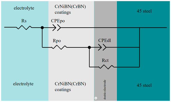 In order to understand the electrochemical construction of CrNiBN coatings, the equivalent circuit (EC) was used to fit EIS results [38,39]. Since two capacitive arcs and two peaks are observed in Nyquist and Bode plots, the equivalent circuit with a dual-time-constant as shown in Figure 8 was used to fit the EIS data. In this equivalent circuit, the electrolyte resistance (Rs) originates from the solution ohmic contribution between the working electrode and the reference electrode. The pore resistance (Rpo) reflects the coating’s barrier effect against electrolyte penetration with CPEpo being the corresponding coating capacitance. The charge transfer resistance (Rct) is related to the formation of the double layer at the 45 steel/electrolyte interface with CPEdl being the corresponding double-layer capacitance. Among these, the constant phase element (CPE) is used to describe non-ideal capacitive behavior, and its impedance expression is