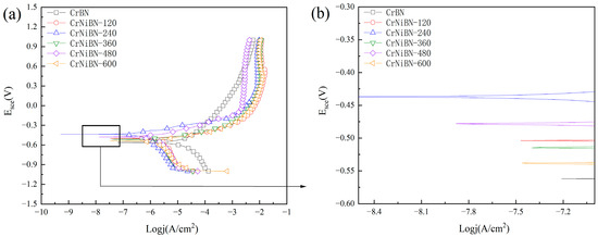 Generally, the self-corrosion current density reflects the corrosion rate of coatings from a kinetic perspective. The lower its value, the slower the corrosion rate, indicating better corrosion resistance. Figure 9 shows the polarization curves of CrBN and CrNiBN coatings. First of all, the polarization curves of CrNiBN coatings shift to left direction as compared to that of CrBN coating after Ni incorporation as shown in Figure 9a. Namely, the corrosion current density becomes lower, and corrosion resistance becomes stronger. On the other hand, although CrNiBN-360 coating presents the highest self-corrosion potential of −0.4369 V, CrNiBN-240 coating presents the second highest self-corrosion potential of −0.4379 V as shown in Figure 9b. In contrast, the CrBN coating and CrNiBN-600 coatings present the lowest self-corrosion potential around −0.5411 V. These results of self-corrosion potential are consistent with the OCP results shown in Figure 5.
