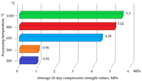 The graph (Figure 2) data show that when diatomite was modified at a temperature of 900 °C, the compressive strength was 5.02 ± 0.251 MPa, and at a temperature of 1100 °C, the compressive strength was 5.3 ± 0.265 MPa. In the future, research work will adopt a modification of diatomite at a temperature of 900 °C, since a higher temperature is less economically feasible and the strength gain is only 5.5%.