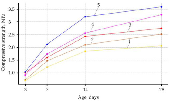 An assessment of the compressive strength of modified diatomite is shown in Figure 2, based on the results of testing samples of cubes measuring 70.7 × 70.7 × 70.7 mm at an age of 28 days.