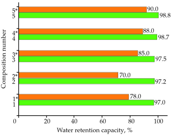 4. The water retention capacity of the compositions was determined in accordance with government standards [28]. Before testing, 10 sheets of used blotting paper with a size of 150 × 150 mm were weighed with an error of 0.1 g, placed on a sheet of glass with a size of 150 × 150 mm and a thickness of 5 mm. A layer of gauze was placed on top of the blotting paper, a metal ring with an internal diameter of 100 mm and a height of 12 mm was mounted on it, and everything was weighed again. Then, the thoroughly mixed solution mixture was placed at the edge of the metal ring, weighed, and left for 10 min. The metal ring with the solution was then carefully removed with gauze, and the blotting paper was weighed with an error of up to 0.1. The water retention capacity of the finishing mixture was determined by the percentage of water in the sample before and after. The water retention capacity was determined twice for each sample and calculated as the arithmetic mean of the results of two determinations that differed from the lower value by no more than 20%.