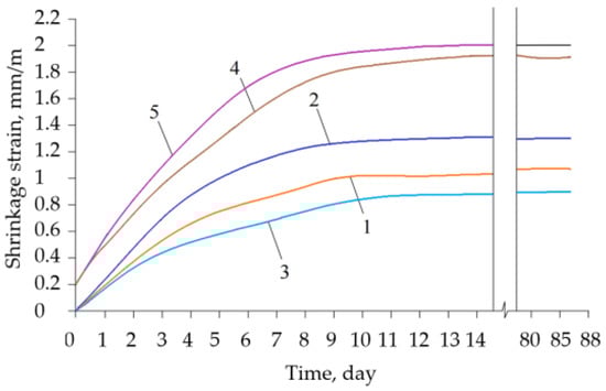 In order to determine the crack resistance of the developed thermal insulation compositions, shrinkage deformations of coatings during hardening were measured. Shrinkage deformations were measured using an IZA–2 optical comparator. Figure 7 shows a graph of changes in shrinkage properties of coatings based on the following compositions: No. 1, No. 2, No. 3, No. 4, No. 5, where the lime is 22.89%, 26.29%, 29.89%, 33.29%, 39.89%; white Portland cement 5%, modified diatomite 51%, 50.6%, 49%, 45.6.%, 39%; perlite sand 20%, 17%, 15%, 15%, 15%, water retaining additive-modified hydroxypropyl methyl cellulose AstoCELL MV 50 G CS 0.1% by weight of lime; Berolan LP–W7, air-entrapping additive, sodium olefin sulfonate 0.01% by weight of lime, and redispersible copolymer powder Mowilith PulverDM 1142P 1% by weight of lime.