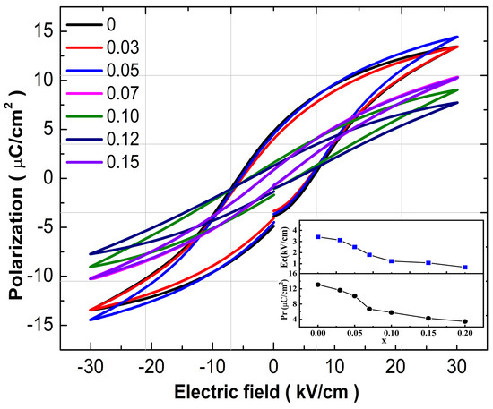 - Sharma, P.; Berwal, N.; Ahlawat, N.; Maan, A.; Punia, R. Study of structural, dielectric, ferroelectric and magnetic properties of vanadium doped BCT ceramics. Ceram. Int. 2019, 45, 20368–20378. [Google Scholar] [CrossRef]