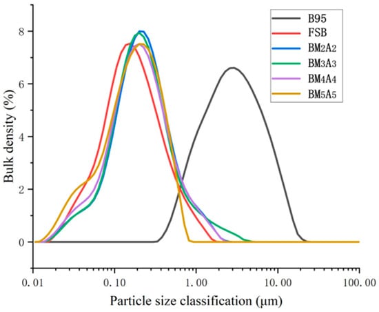 As shown in Figure 2, the B95 boron powder exhibits a relatively broad particle size distribution, primarily ranging from approximately 1 to 10 μm, with a peak value at 2.9 μm, indicating a generally large particle size. In contrast, the samples subjected to ball milling dispersion and Mg/Al coating treatments (FSB, BM2A2, BM3A3, BM4A4, and BM5A5) show a clear leftward shift in the particle size distribution, indicating a significant reduction in the average particle size. These treated samples display particle size distributions predominantly within the 0.1–1 μm range, with peak values located near 0.2–0.3 μm. This suggests that the ball-milling treatment effectively achieved particle size reduction and dispersion.
