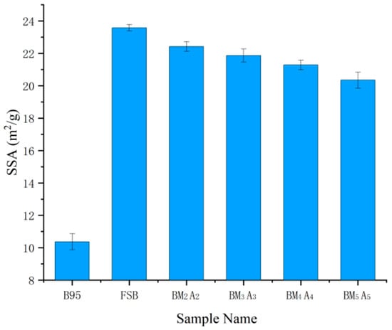 The Mg/Al-coated boron powders developed in this study are intended for use as high-energy fuels. Increasing the specific surface area of the powder is beneficial for enhancing the material’s reactivity, thereby promoting rapid combustion and efficient energy release of boron. Therefore, it is essential to investigate the changes in specific surface area between Mg/Al-coated and uncoated boron powders. Based on the single-point Brunauer–Emmett–Teller (BET) adsorption theory, the specific surface area of the powders was measured using a V-Sorb 2800 fully automatic specific surface area and porosity analyzer (Gold APP Instruments Corporation, Beijing, China). The results are shown in Figure 3.