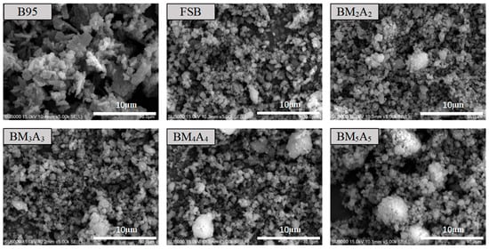 The microstructures of the B95 boron powder and the Mg/Al-coated boron powders were analyzed using a SU5000 field emission scanning electron microscope (FESEM, Hitachi High-Technologies Corporation, Tokyo, Japan). The results are shown in Figure 4.