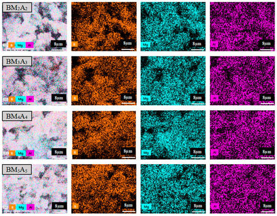 As shown in Figure 5, EDS mapping was performed on samples BM2A2, BM3A3, BM4A4, and BM5A5. In the elemental distribution maps, boron (B) is represented in orange, magnesium (Mg) in cyan, and aluminum (Al) in purple. The maps clearly show that Mg and Al are distributed across the regions containing B, indicating that a Mg/Al coating layer has been successfully formed on the surface of the boron particles.