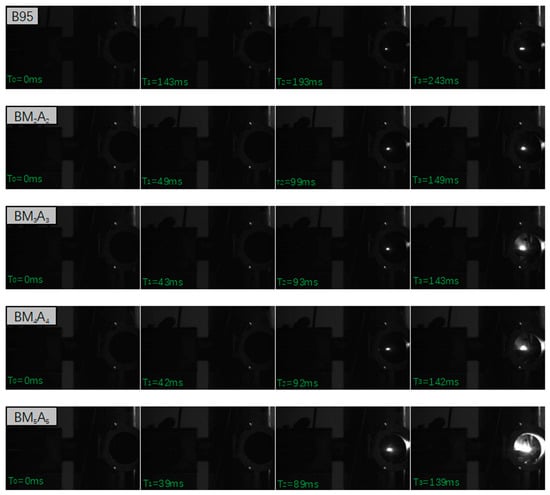 A high-speed camera was used to record the flame evolution during laser ignition of the five powder samples in a pure oxygen atmosphere. As shown in Figure 6, four sequential frames were captured for each sample: the pre-ignition state (T0), the ignition moment (T1, corresponding to the ignition delay time), and the flame states at 50 ms (T2) and 100 ms (T3) after ignition.