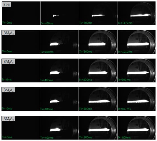 As illustrated in Figure 7, the B95 boron powder exhibits no visible flame at the initial ignition stage, remaining dark. At 400 ms, a small, concentrated, and slender flame appears, indicating a relatively slow combustion initiation; at this time, the flame intensity significantly increases, and the flame volume expands. By 1224 ms, the flame length reaches its maximum, and the flame intensity is at its highest; however, the flame width is relatively narrow and uneven, suggesting incomplete combustion of part of the powder. In contrast, boron powders coated with Mg/Al display significantly greater flame intensity and size at various time points compared to the B95 boron powder. Furthermore, with increasing Mg/Al-coating amounts, both the flame intensity and size exhibit an increasing trend. Notably, sample BM5F5 demonstrates the best ignition and combustion performance, with rapid initial combustion and the most prominent flame intensity and size among the five tested fuels. These observations, combined with the combustion velocity results calculated for different samples in Table 2, further confirm that Mg/Al coating promotes combustion velocity enhancement, and that increasing the coating amount accelerates the combustion speed.