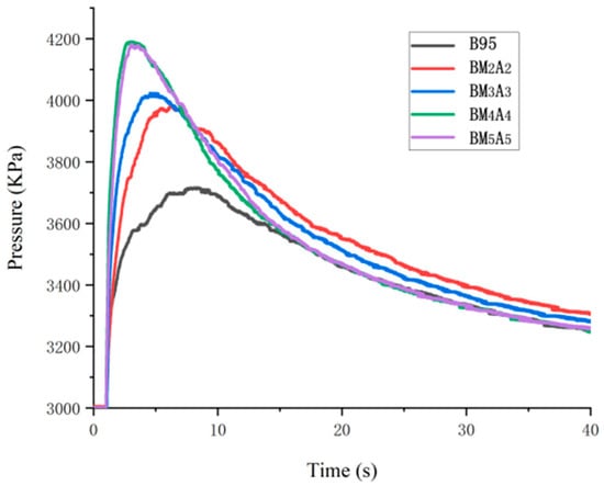 The powder combustion pressure was tested using an HB-Pt300 constant-volume combustion device (SiChuan Hbst. Co., Ltd., Mianyang, China). A sample of 50.0 mg was placed on the base of a sealed explosion chamber. The pressure valve was adjusted to ensure no leakage inside the chamber, maintaining an oxygen environment at 3 MPa. Ignition was initiated by applying 10 V to metal electrodes. The entire combustion process was completed within 40 s, during which the pressure variation in the sample was recorded. Combustion pressure tests were conducted on five samples, and the results are shown in Figure 8. The combustion time (Tburn) and peak pressure (Ppeak) were recorded, and the pressure rise rate per unit combustion time, R = Ppeak/Tburn, was calculated. The results are summarized in Table 3.