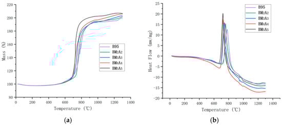 Thermogravimetric analysis (TGA) and differential scanning calorimetry (DSC) measurements were carried out using an SDT Q600 V20.9 Build 20 simultaneous thermal analyzer (TA Instruments, New Castle, DE, USA). The measurements were conducted in an air atmosphere with a flow rate of 50.0 mL/min, and the heating rate was set to 5 °C/min up to 1300 °C. The thermal behavior (TG-DSC) of B95 boron powder and Mg/Al-coated boron powders was tested, and the results are shown in Figure 9. Thermal performance parameters of B95 boron powder and Mg/Al-coated boron powders are presented in Table 5.
