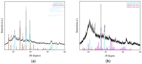 Phase analysis of the combustion residues of B95 boron powder and BM4A4 was conducted using XRD: (a) XRD patterns of the combustion residues of B95 boron powder; (b) XRD patterns of the combustion residues of BM4A4.