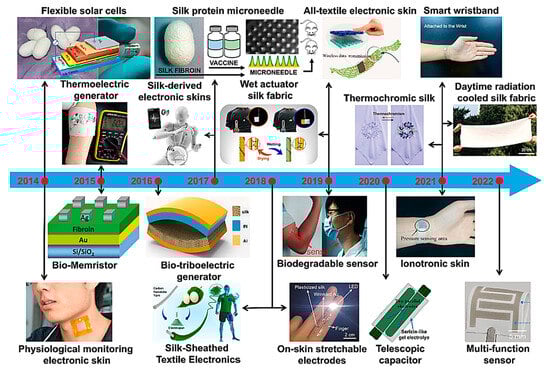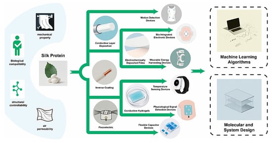 - Xing, T.; He, A.; Huang, Y.; Luo, Y.; Zhang, M.; Wang, Z.; Shi, G.; Ke, J.; Bai, S.; Zhao, F.; et al. Silk-based flexible electronics and smart wearable textiles: Progress and beyond. Chem. Eng. J. 2023, 474, 145534. [Google Scholar] [CrossRef]