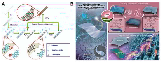 (A) Mechanism for efficient graphene nanosheet immobilization. Reprinted with permission from Ref. [19]. Copyright 2015 Royal Society of Chemistry. (B) Electrostatic self-assembly process of GO and ANI on silk fabrics. Reprinted with permission from Ref. [20]. Copyright 2020 American Chemical Society.