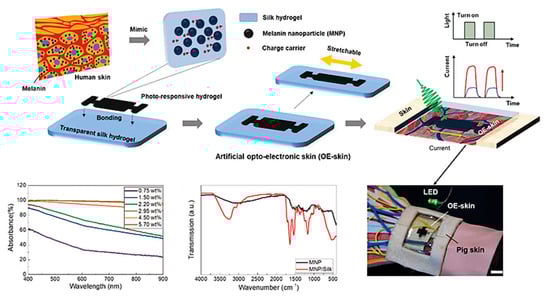 Artificially generated optoelectronic skins (OE-skins) fabricated using two biomaterials: silk protein and melanin. Reprinted with permission from Ref. [40]. Copyright 2022 John Wiley and Sons.