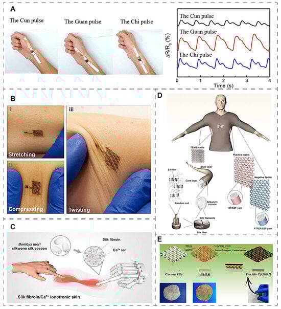 (A) rGO/SF pressure sensor detecting pulse signals at different wrist locations. Reprinted with permission from Ref. [46]. Copyright 2024 Royal Society of Chemistry. (B) Silk-BioE on the skin under stretching, compressing, and twisting motions. Reprinted with permission from Ref. [48]. Copyright 2025 John Wiley and Sons. (C) Schematic of silk fibroin/Ca (II) ionotronic skin. Reprinted with permission from Ref. [49]. Copyright 2020 John Wiley and Sons. (D) Schematic illustration of the SF/PTFEF EHT. Reprinted with permission from Ref. [50]. Copyright 2019 Springer Nature. (E) Schematic illustration of the fabrication process of the C@Si@G composite. Reprinted with permission from Ref. [51]. Copyright 2021 Elsevier.