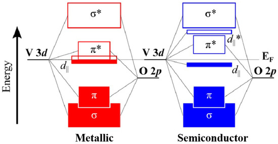 In 1959, Morin first discovered the phase transition in the material system: under the excitation of light, heat, etc., undergoes a reversible phase transition from the semiconductor phase to the metallic phase []. This property gives great potential for applications in smart windows, photoelectric switches, and other fields. Changes in the crystal structure that accompany during phase transitions will also significantly affect the characteristics of its electronic band structure. Figure 1 shows the band structure of in phase. In the metallic phase of , the orbitals of and the orbitals of undergo orbital hybridization, resulting in a wider bonding orbital and a narrower bonding orbital. Although the overall bandwidth is up to 2.5 eV, the orbitals are only partially filled, resulting in a partial overlap with the band, and the Fermi level is precisely in the center of this overlapping band, which is the fundamental reason for the metallic conductivity of the material. When is in the semiconductor phase, the tilt of the the [] octahedron improves the hybridization intensity of the orbitals, causing the band to shift upwards. At the same time, the V atom moves, causing the orbitals to split, forming the occupied state and the non-occupied state . At this point, the band is completely above the Fermi level and becomes an empty conduction band, while the band exists as a full-valence band, presenting typical semiconductor characteristics [].