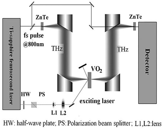 Terahertz radiation (0.1–10 THz) occupies the spectral region between microwaves and infrared waves. Since the late 20th century, it has emerged as a significant frontier in scientific research [,,]. Advances in femtosecond laser technology, together with the development of efficient terahertz sources and detectors [], have collectively driven breakthroughs in key enabling technologies. , a prototypical phase-change material, has attracted extensive research interest due to its abrupt conductivity change during the insulator-to-metal transition (IMT). Pioneering studies since the year 2000 have demonstrated that thermal excitation [], optical excitation [,], and electrical excitation [] can effectively modulate terahertz transmission by more than three orders of magnitude, providing ideas for the development of terahertz devices.