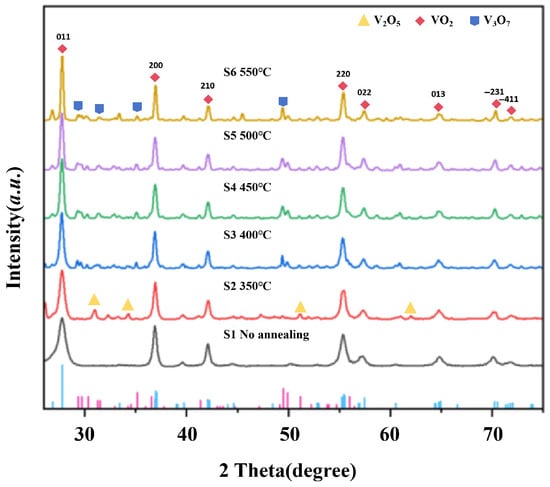 The crystal structure of the samples obtained at different heat treatment temperatures was characterized by X-ray diffraction (XRD) to analyze the variation of the crystal structure with heat treatment temperature. The test results are shown in Figure 5. Distinct characteristic diffraction peaks at 2 = 27.80°, 37.09°, 42.27°, 55.45°, 57.42°, 65.00°, 70.25°, and 72.02° were observed in the XRD pattern of the unheat-treated sample S1. According to JCPDS PDF card 09-0142, these diffraction peaks all originated from the monoclinic structure , corresponding to the (011), (200), (210), (220), (022), (013), (231), and (−411) crystal directions, respectively. The main characteristic diffraction peaks of the heat-treated samples were similar to those of the unheat-treated sample S1, indicating that the main crystal phase of the six samples remained M-phase throughout the heat treatment process. Figure 5 also shows a small number of diffraction peaks corresponding to in the 350 °C heat-treated sample S2, which may be the result of the oxidation of ; as the heat treatment temperature gradually increased, the impurity peaks associated with disappeared, and diffraction peaks associated with appeared, with increasing intensity. Despite the formation of impurities during heat treatment, the main component of most samples remained .