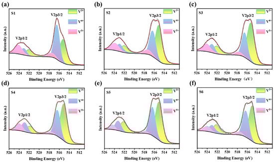 In order to study the influence law of the heat treatment temperature on the composition and valence state of , X-ray photoelectron spectroscopy (XPS) tests were conducted on six samples. The surface XPS spectra of the V state are shown in Figure 6, and the peaks were normalized based on the 284.8 eV binding energy of C1s. The characteristic peaks of V and V can be clearly observed in Figure 6 due to orbital splitting []. The two characteristic peaks were fitted within the binding energy ranges of (516.9 eV–517.7 eV), (515.7 eV–516.2 eV), and (515.2 eV–515.9 eV) to obtain their component ratios []. The reduction of ions from to V is accompanied by electron transfer. The main chemical reactions that occur in a vacuum are as follows []: