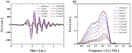 The time-domain and frequency-domain waveforms of transmitted terahertz pulses under different optical power modulation conditions: (a) time domain. (b) frequency domain.