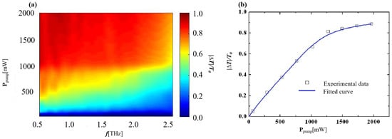 Figure 8a shows the dependence of the modulation depth on the modulated optical power and carrier frequency. It can be seen from the figure that under the same optical power, the modulation of terahertz waves with different frequency components is significantly different. When the excitation light power is high, the modulation of the low-frequency components is close to 100%, almost saturated, while the high-frequency components still have room for further modulation. Because of this frequency-dependent characteristic, after the terahertz pulse passes through the thin film, the proportion of different frequency components is out of balance, resulting in a distortion of the spectral shape, which in turn causes a distortion of the time-domain waveform of the pulse.