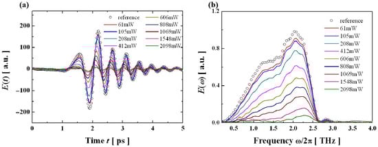 Figure 7a,b show the terahertz pulses and their corresponding spectra measured at different modulated optical powers. Apparently, at a low power (<400 mW) modulation, the modulation of terahertz pulses is similar to that of 520 nm laser modulation, with no significant changes in the time-domain waveforms and spectral shapes of the pulses. However, at high power, the terahertz pulses are severely distorted, with a significant distortion of the spectral shape. This indicates that there is a significant difference in modulation corresponding to different frequency components.