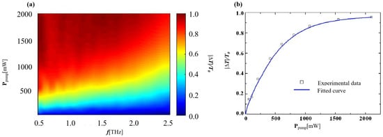 Figure 10a shows the modulation depth at different femtosecond laser powers and frequencies. Compared with the modulation characteristics of the CW laser at 976 nm (Figure 8a), the modulation of the femtosecond laser is larger with the same modulation power and the same terahertz frequency component. Furthermore, at the same modulation power, the modulation depth at high frequencies is smaller than that at low frequencies, which is similar to the effect of CW lasers.
