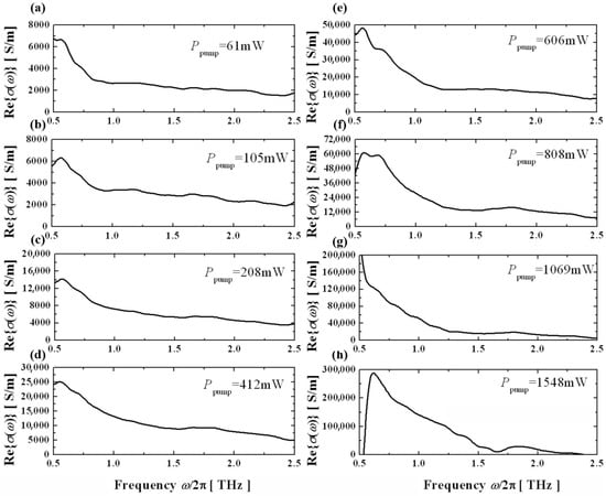 The calculated complex conductivities at different excitation light powers are shown in Figure 11. It can be seen that with the increase in the excitation light power, the real part of the conductivity gradually increases and comes closer to the range of common metal conductivities (> S/m).