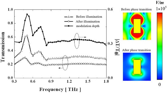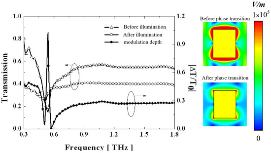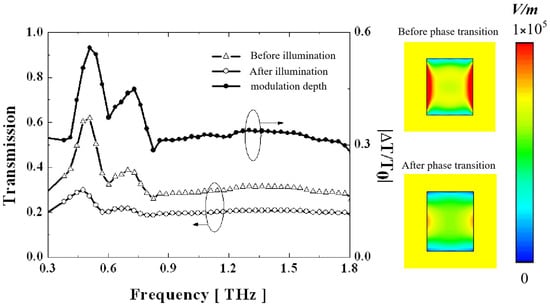 From the graph, we can see that the transmittance of most frequencies decays to varying degrees after illumination; however, at the resonant frequency, the terahertz transmittance increases significantly. Because DLSPs exhibit resonant reflection properties—that is, when there is no light, the DLSPs excited by the metal block resist terahertz transmission at the resonant frequency—when exposed to light, the DLSP’s blocking effect on terahertz waves is significantly weakened because the resonance conditions of the DLSP are disrupted by the phase-changed thin film. As a result, despite the same attenuation caused by the phase transition of (e.g., for other frequency components), the overall transmission rate of the terahertz component at the resonant frequency still increased. Thus, we obtained a distinct property from samples 1 and 2, that is, the attenuation of the thin film instead brought an increase in terahertz transmittance. The simulated electric field distribution also fully reflects the disruption of DLSP resonance.