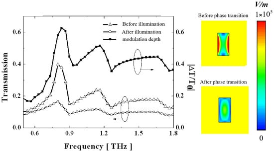 Samples 3 and 4: The principle of samples 3 and 4 are different from those of samples 1 and 2. They achieve terahertz modulation by destroying the DLSP resonance []. Figure 14 and Figure 15 correspond to the experimental results and simulated electric field distribution of sample 3 and sample 4, respectively. The polarization direction of the incident terahertz is along the y direction.