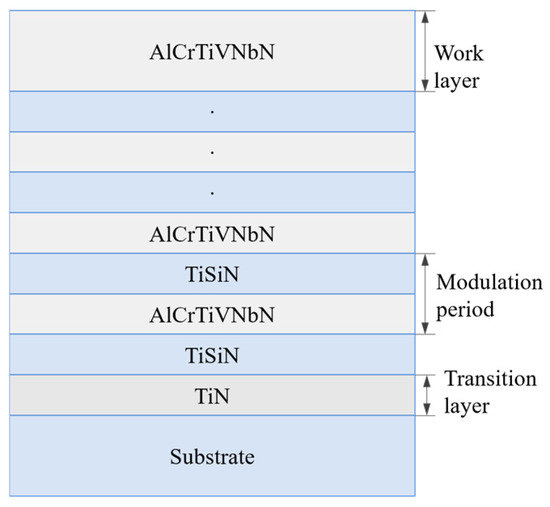 JCP-350M2 (Techno Company, Beijing, China) was utilized to synthesize the AlCrTiVNbN/TiSiN nano multilayer films. The vacuum level inside the chamber was 3 × 10−3 Pa. Argon was introduced as the working gas. The targets underwent pre-sputtering for 10 min, while the substrates were etched with Ar ions for 10 min to eliminate surface impurities and oxides. Nitrogen was introduced as the reactive gas, maintaining an Ni−Ar flow rate ratio of 1:1. The film deposition was carried out at room temperature. The substrate was not preheated. A TiN transition layer was deposited for 60 min to enhance film−substrate adhesion. The AlCrTiVNb target was controlled using DC power of 110 W, resulting in a deposition speed equal to 0.09 nm·s−1. The TiSi target was controlled by RF power at 100 W, producing a deposition rate equal to 0.045 nm·s−1. The AlCrTiVNb and TiSi targets were alternatively activated to fabricate the AlCrTiVNbN/TiSiN nano multilayer film. Figure 1 shows the nano mutilayer structure. The thickness of the AlCrTiVNbN layer was kept at 3 nm, while the TiSiN layer thicknesses were set at 1, 2, 3, and 4 nm, resulting in λ values of 4, 5, 6, and 7 nm, respectively. The detailed parameters are outlined in Table 1.