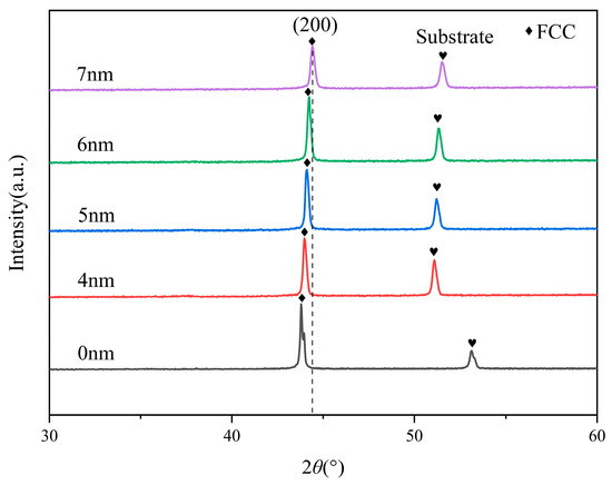 Figure 2 illustrates the XRD patterns, which show an FCC structure with a preferred planar direction of (200). Table 2 presents the diffraction angle 2θ, interplanar distance and the full width at half maximum (FWHM), revealing a positive correlation between λ and 2θ, while the interplanar distance shows a negative correlation.
