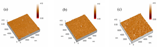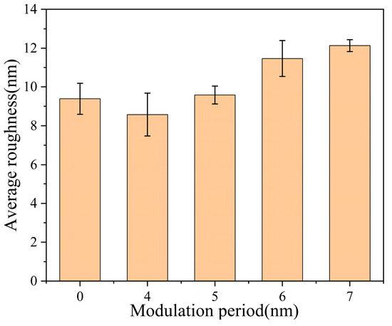 Figure 4 and Figure 5 depict the 3D morphologies and surface roughness of the AlCrTiVNbN/TiSiN nano multilayer films measured by AFM, respectively. The smallest particle size is seen on the surface of the M4 film. As λ increases, the size of the particles becomes bigger. The size of the particles is the largest on the surface of the M7 film, which coincides with the SEM image in Figure 3. As λ increases, the surface roughness of the films increases. As λ increases, the speed of deposition decreases and the atoms do not easily diffuse, which leads to the atoms forming “island” shapes and grow into bigger particles during deposition.